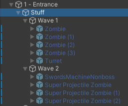 On the other hand, Stuff needs to have a strict hierarchy for the arenas to work properly. Inside of it, you can create Wave gameobjects that will contain the enemies for that wave and Encounters that can contain waves inside of them. You will learn about them by proceeding further into the wiki.