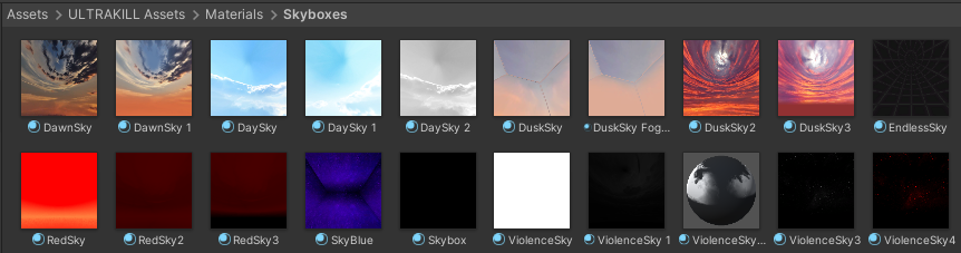 To add a skybox from the orginal game, go into ULTRAKILL Assets/Materials/Skyboxes and simply drag a material into the scene.