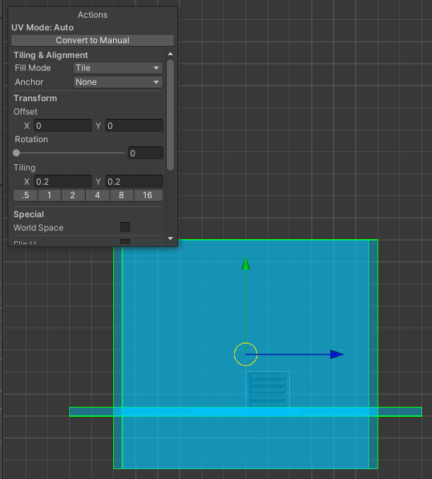 To do so, open UV editor in the ProBuilder window. In there, set the scale to 0.2 both in X and Y axises. You can also change rotation and location of the texture. By pressing the gizmo button in the UV window, you will be able to manipulate the texture in the scene itself.
