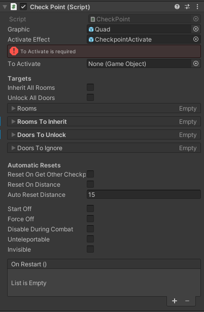 - To Activate: Any object that is placed in that field will be activated when the checkpoint is hit. This is usually used for activating rooms that were disabled for optimization purposes, however, you can use it for more advanced level logic.